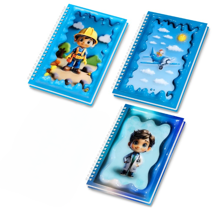 A5 Boyutunda Parlak Yüzeyli 3 Boyutlu Spiralli Defter 3'lü Koleksiyon küçük doktor , pilot ve uçak , inşaat işçisi