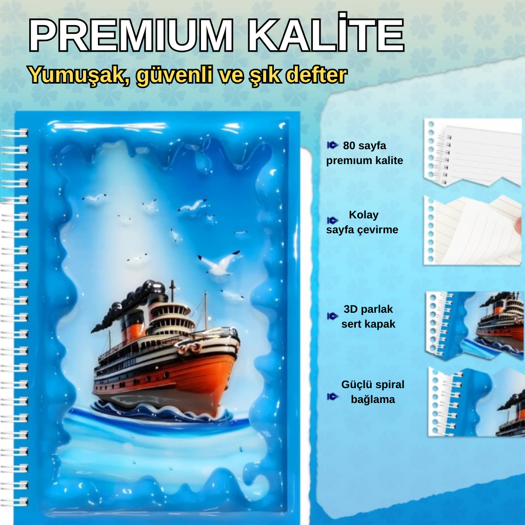 A5 Boyutunda Parlak Yüzeyli 3 Boyutlu Spiralli Defter 3'lü Koleksiyon kurtarma helikopteri , deniz gemisi , bisikletli tavşan