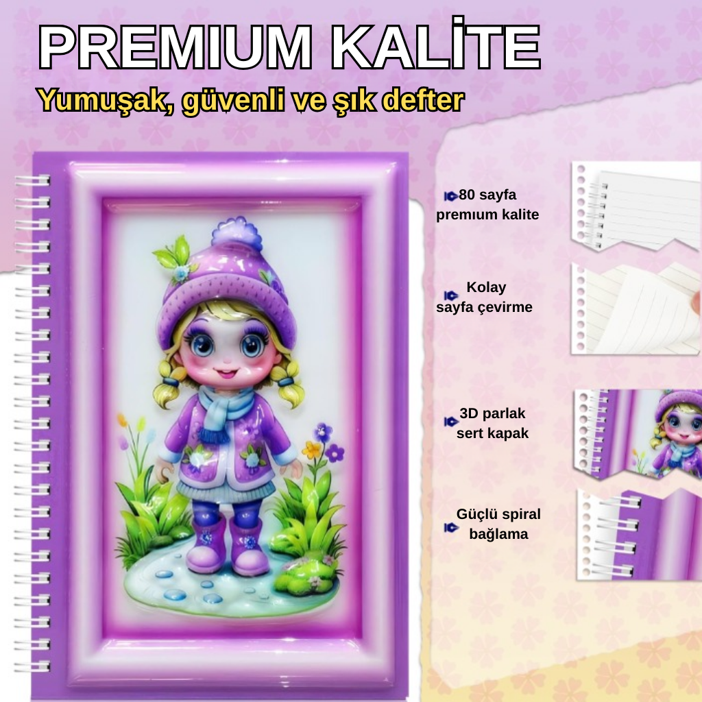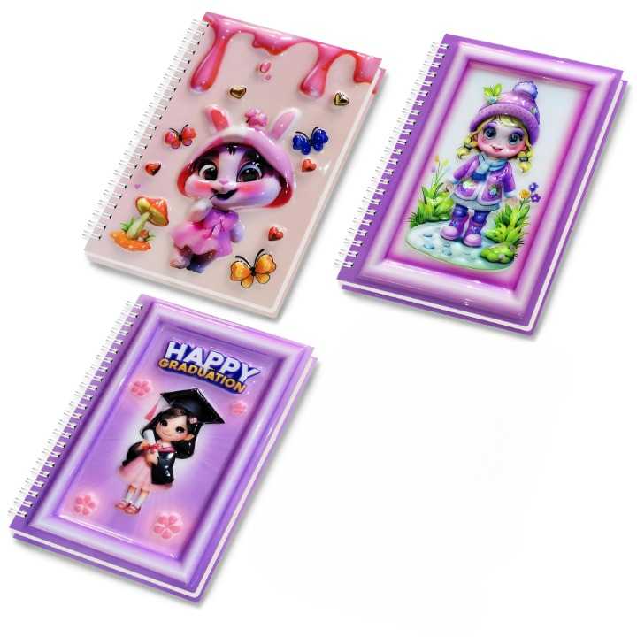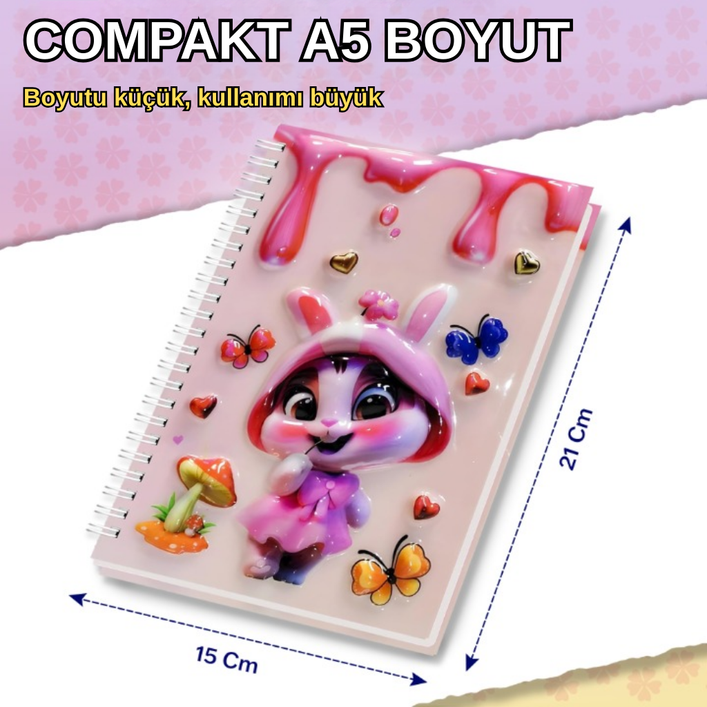 A5 Boyutunda Parlak Yüzeyli 3 Boyutlu Spiralli Defter 3'lü Koleksiyon mezuniyet kızı , pere kız , pembe tavşan