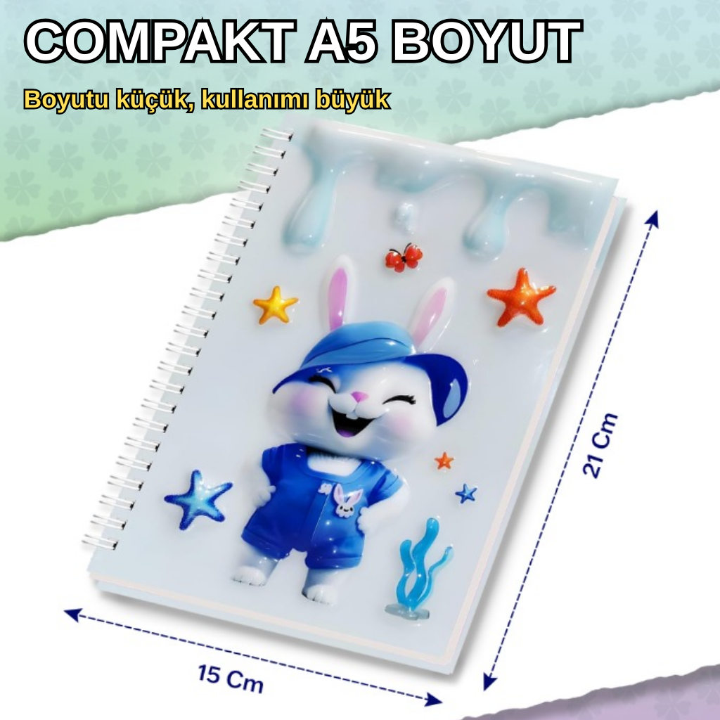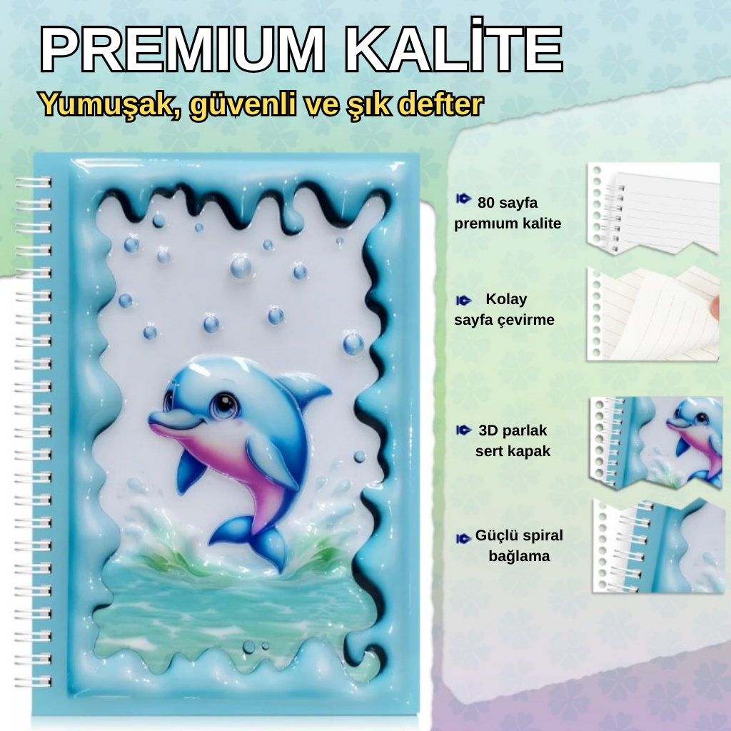 Notlarınıza tatlı bir dokunuşla katın! Parlak ve kabartmalı 3D kapağında sevimli tavşan , papağan ve güneş , sevimli dolphin Dayanıklı sert kapak ve sağlam spiral ciltleme ile okul, günlük kullanım veya hediye için mükemmel.