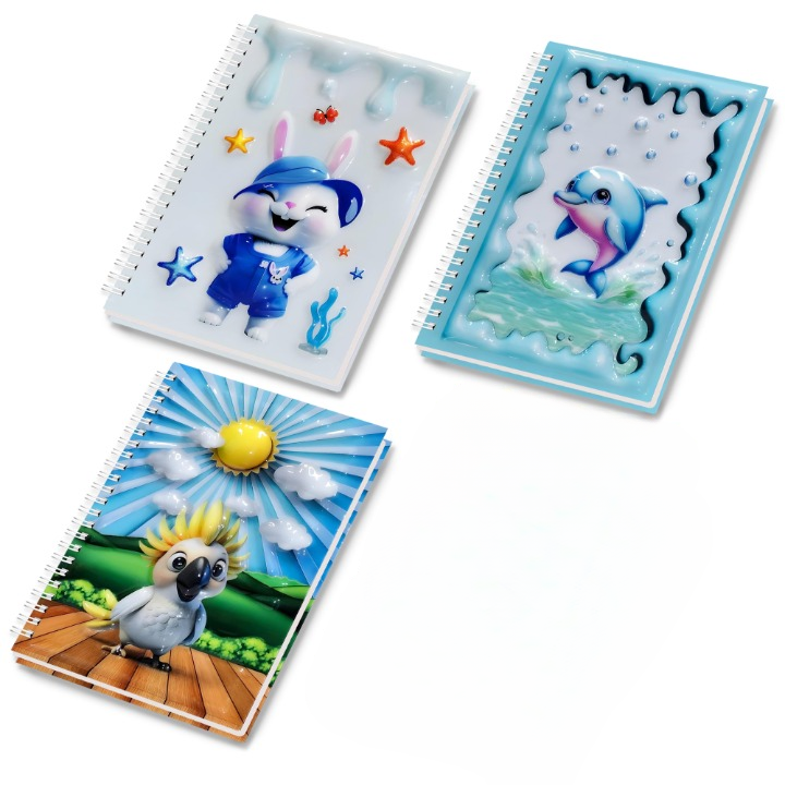 A5 Boyutunda Parlak Yüzeyli 3 Boyutlu Spiralli Defter 3'lü Koleksiyon sevimli tavşan , papağan ve güneş , sevimli dolphin