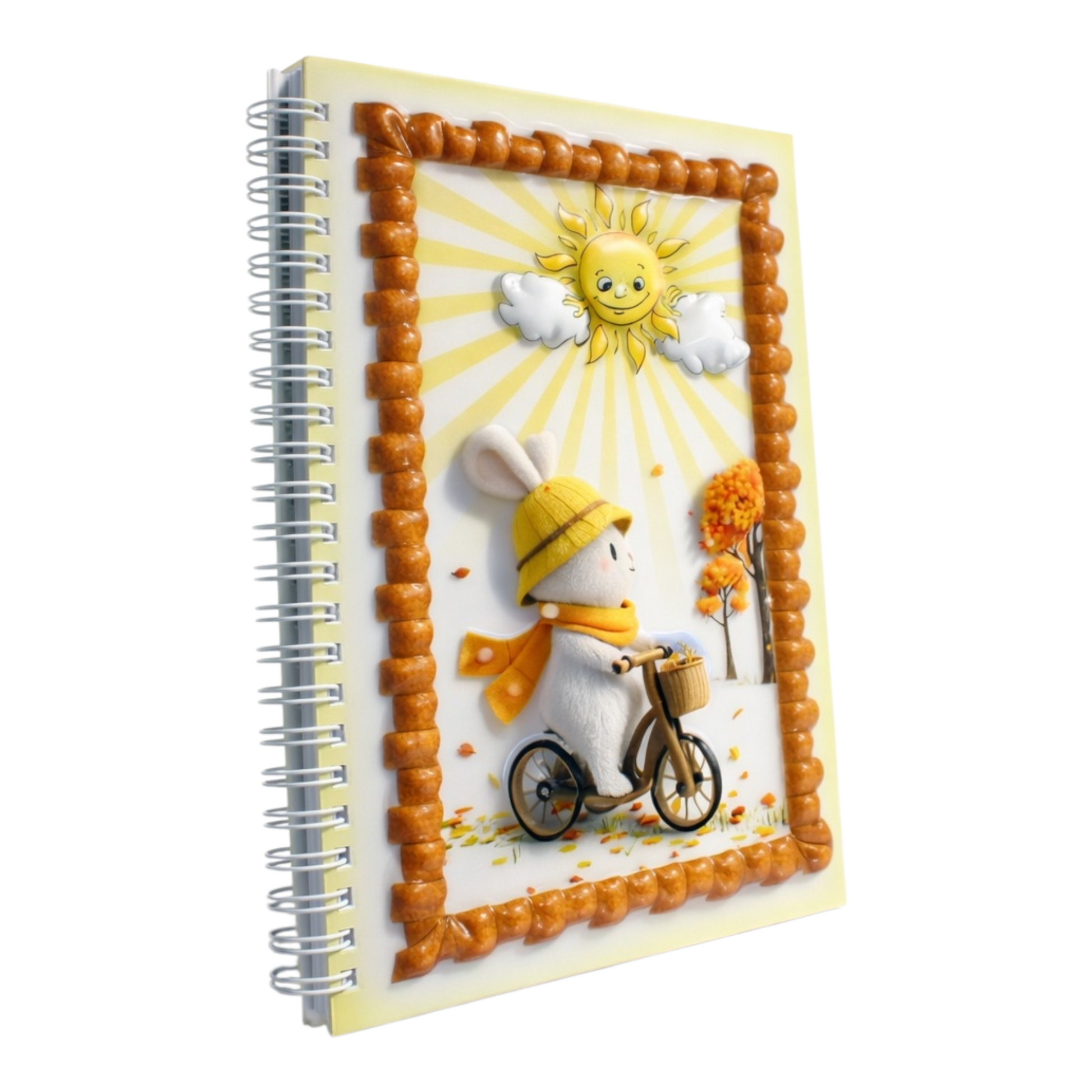 Notlarınıza bahar esintisi katın! Parlak ve kabartmalı 3D kapağında sarı şapkalı ve atkılı sevimli bir tavşan bisiklet sürüyor, üstte ise gülümseyen güneş ve bulutlar yer alıyor. Dayanıklı sert kapak ve sağlam spiral ciltleme ile okul, günlük kullanım veya hediye için mükemmel.
