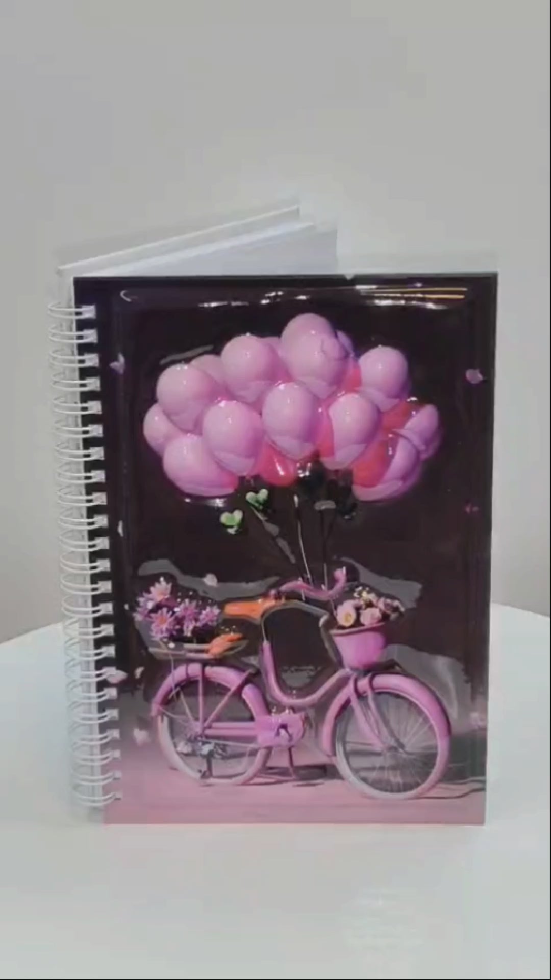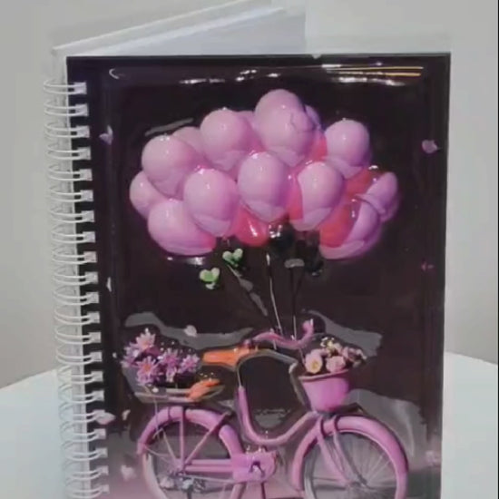Notlarınıza romantik bir dokunuş katın! Parlak ve kabartmalı 3D kapağında pembe balonlar, mor bisiklet ve çiçek sepeti detayları bulunuyor. Dayanıklı sert kapak ve sağlam spiral ciltleme ile okulda, günlük kullanımda veya hediye olarak mükemmel bir seçim.