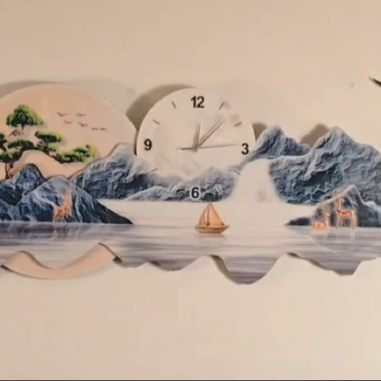 Bu özel tasarım; mavi tonlu dağ manzarası, sakin göl yansıması ve modern saat detayı ile yaşam alanınıza hem estetik hem fonksiyon kazandırır.